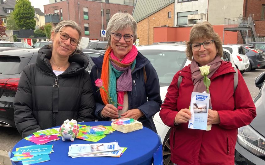 Den Welthospiztag am 11. Oktober 2025 nutzten Ehrenamtliche und Vorstandsmitglieder des Pulheimer Hospizvereins, um über die ambulante Hospizarbeit in unserer Stadt zu informieren. In der Zeit von 10:00 bis 12:00 Uhr führten Teams des Vereins auf dem Marktplatz Pulheim, der Hauptstraße in Stommeln und auf der Kaiser-Otto-Straße in Brauweiler zahlreiche Gespräche mit interessierten Bürgerinnen und Bürgern. Neben Informationsmaterial gab es an den Ständen auch Tütchen mit Blumensamen und Rosen als kleine Geschenke.
