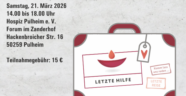 - Ort: Hospiz Pulheim e.V., Forum im Zanderhof, Hackenbroicher Str. 15, 50259 Pulheim