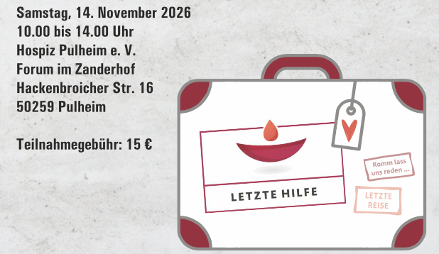 - Ort: Hospiz Pulheim e.V., Forum im Zanderhof, Hackenbroicher Str. 15, 50259 Pulheim